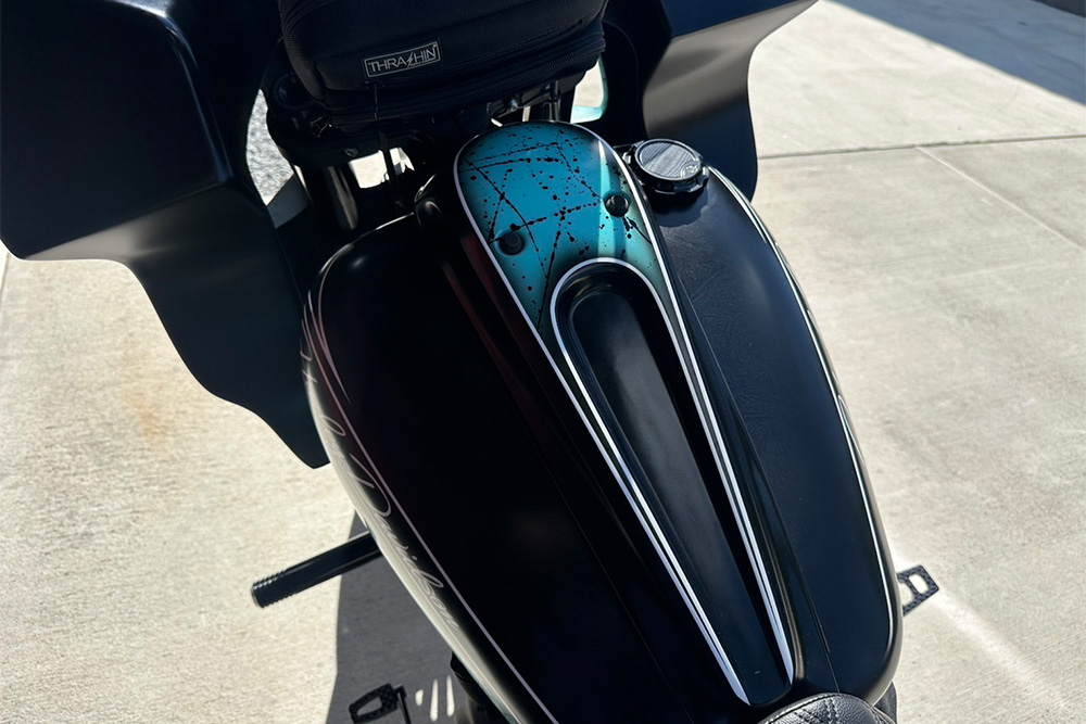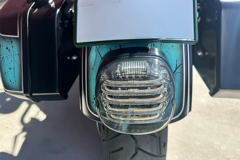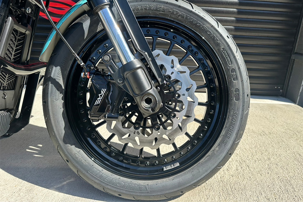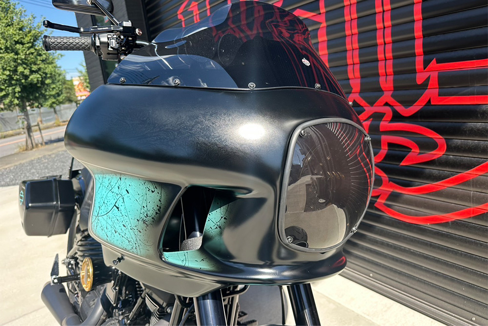 スタイリングとしてまず目を引くのはクロックワークス製のFXRPフェアリングでしょう。ローライダーSTのフェアリングの源流とも言えるデザインはクラブスタイルの定番アイテムです。ウィンドシールドもクロックワークス製のFlareウィンドシールドを使用しており、レトロなシルエットながら走行風の対策にも抜かりありません。
