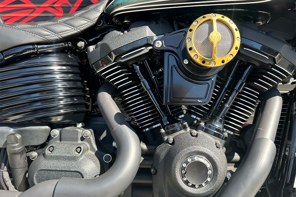 ワンポイントとしてひときわ輝くゴールドのエアクリーナーはビティズデザインの製品です。一般的なエアフィルターを使用するエアクリーナーではなく、フィルターを廃することで吸気を最大限効率化するベロシティスタックになっています。