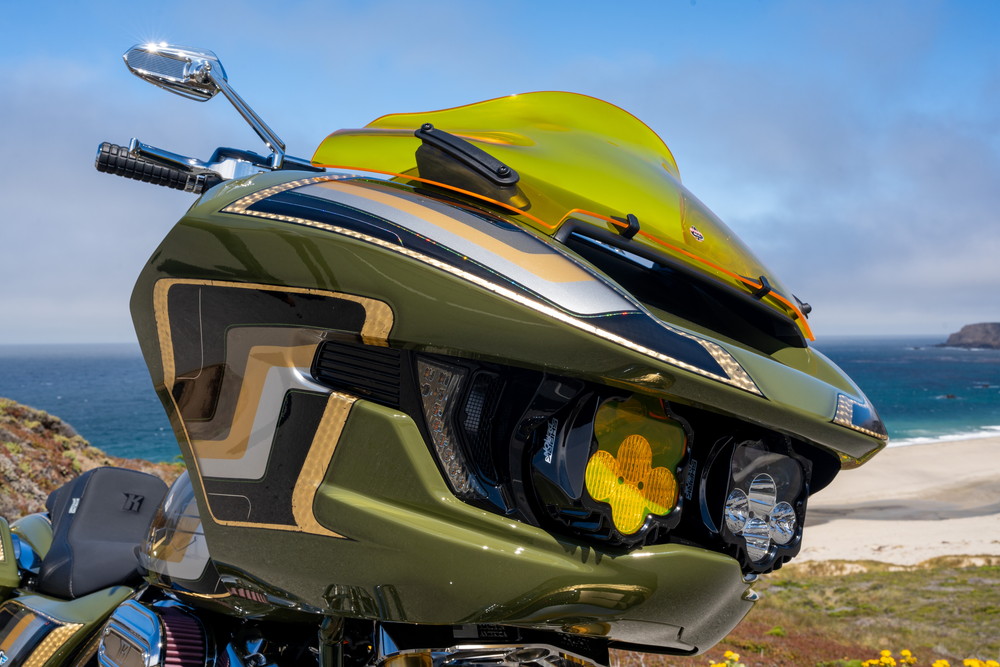 2026年版 Drag Specialties FatBook の表紙を飾るバイクは、人気の2024年ロードグライドをベースに、クロムとカーボンパーツを大胆に組み合わせたカスタムビルドです。