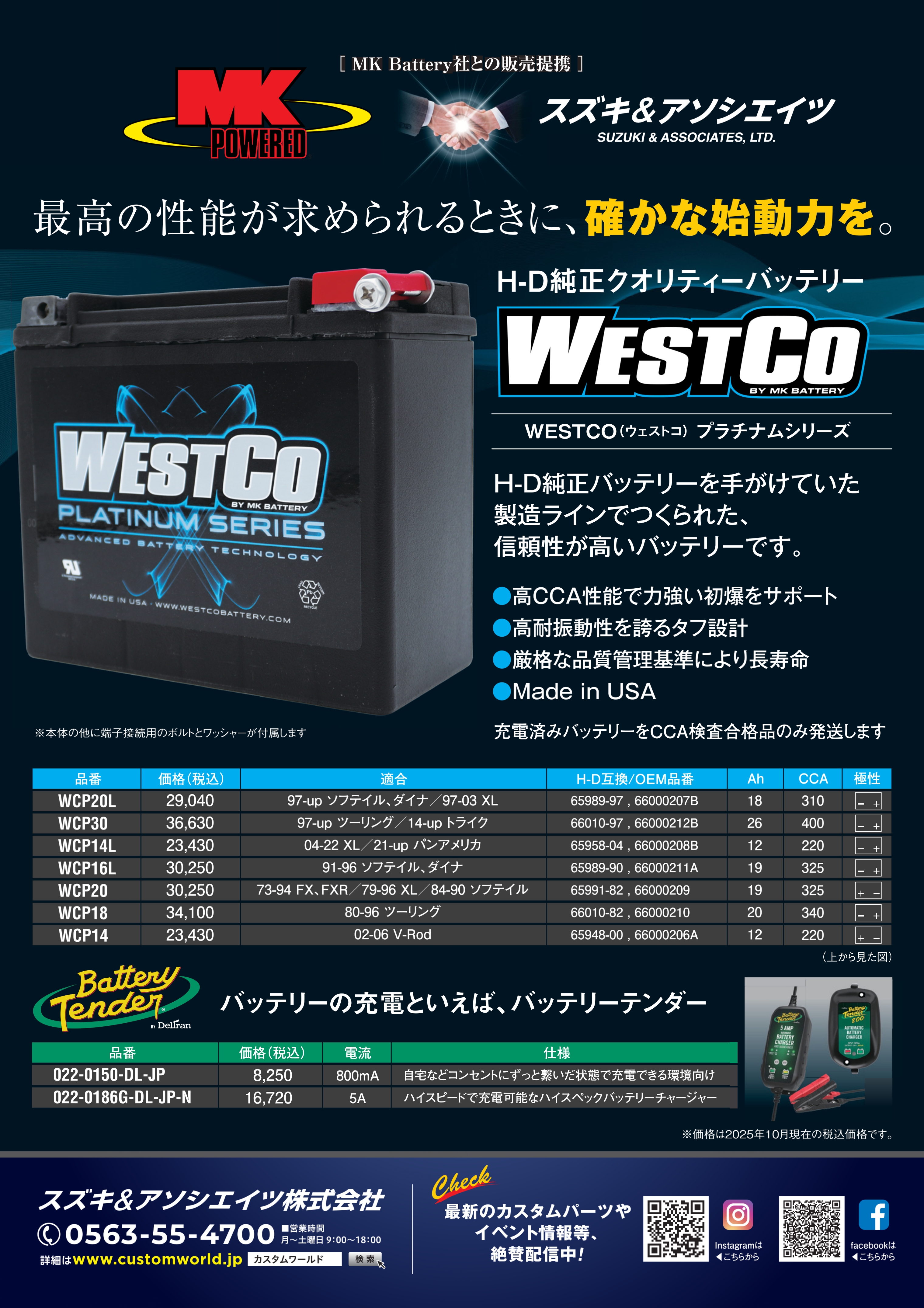H-D純正同等の信頼のクオリティを誇るWestcoバッテリーは、高いCCAで冬場の始動性能も抜群です。スズキ&アソシエイツでは、出荷前充電とCCA検査を実施し、合格品のみをお届けしています。