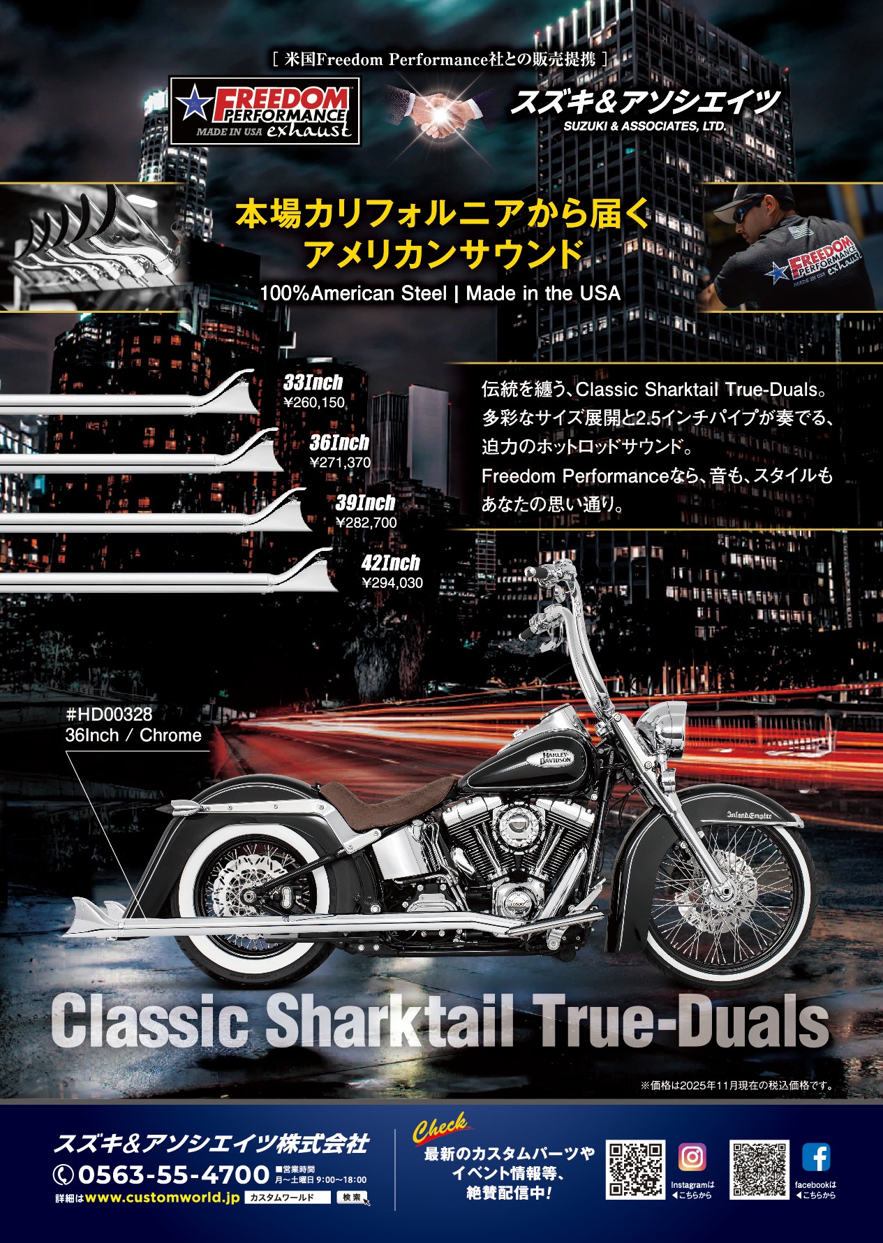 本場カリフォルニア発、100%アメリカンスチール・Made in USAにこだわるFreedom Performance。伝統スタイルを継承する「Classic Sharktail True-Duals」は、2.5″パイプが生み出す迫力のホットロッドサウンドと、美しいクラシックデザインが魅力です。