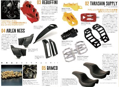 パーツ紹介ではスラッシン、サドルメン、アレンネスの新商品や、それに合わせるのに最適なレブフィニ、バムコの商品が紹介されています。今のトレンドであるカラーパーツを使ったパフォーマンス系カスタムにぴったりです。