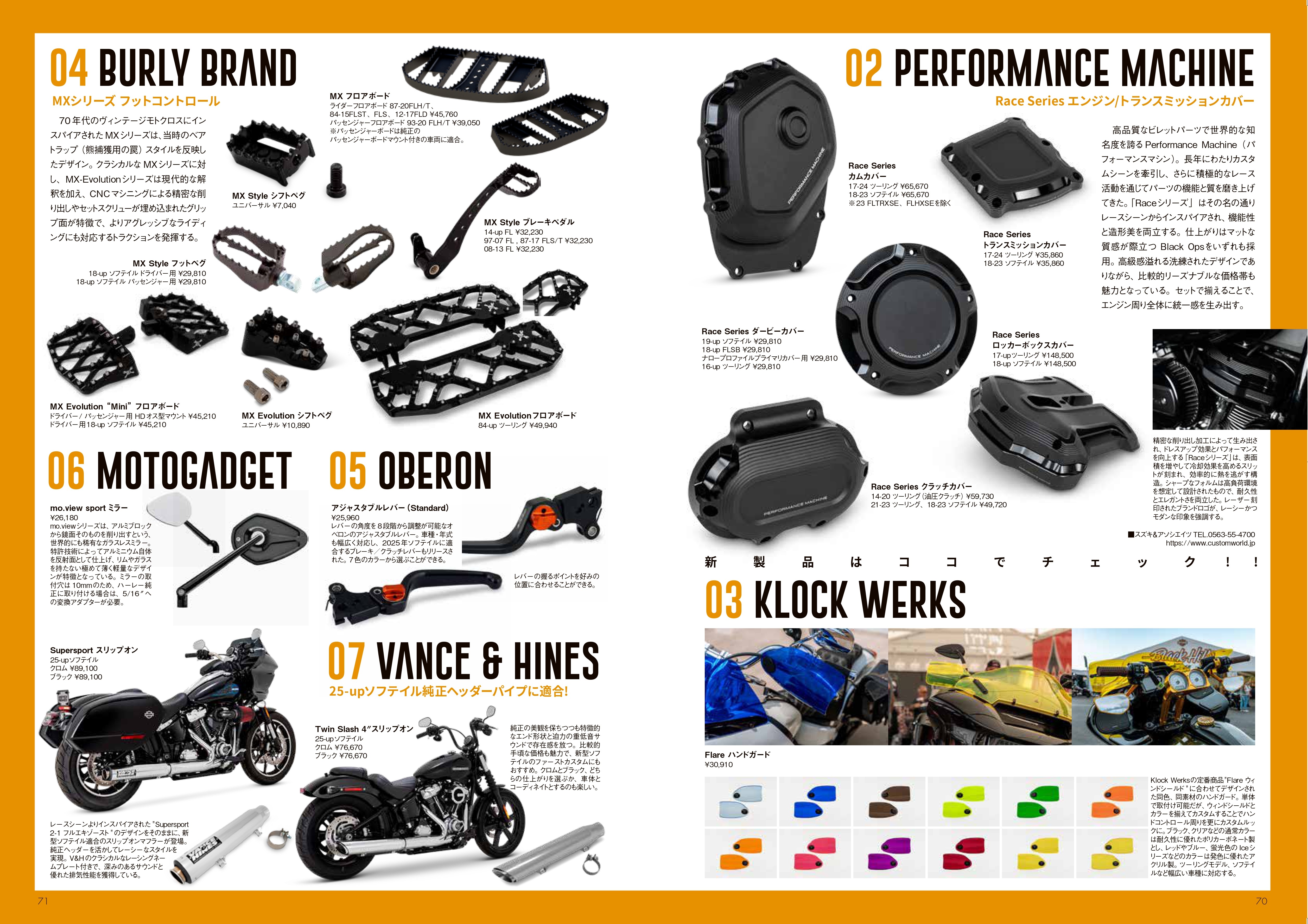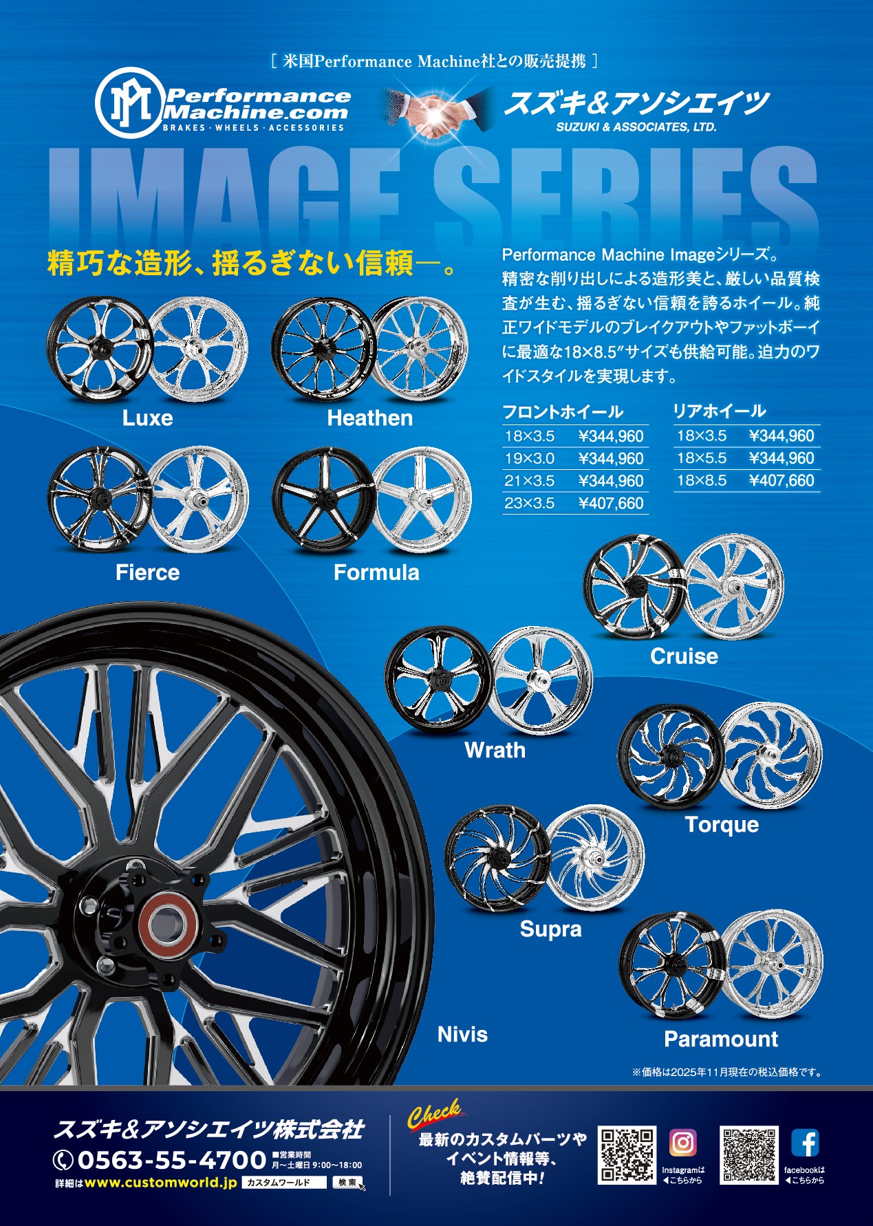 巻末では、当社取扱いブランド、 “Performance Machine ” より「Image Series」ホイールを掲載。精巧な削り出しによる高い質感と信頼性を兼ね備え、足まわりの印象を一気に引き締めます。デザインバリエーションも豊富で、ブレイクアウトやファットボーイをはじめとしたワイドモデルとの相性も抜群。走りの質と存在感を同時に高めたい方に、ぜひ注目していただきたいホイールです!