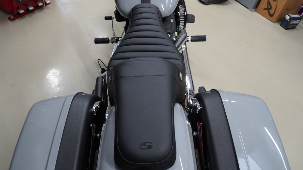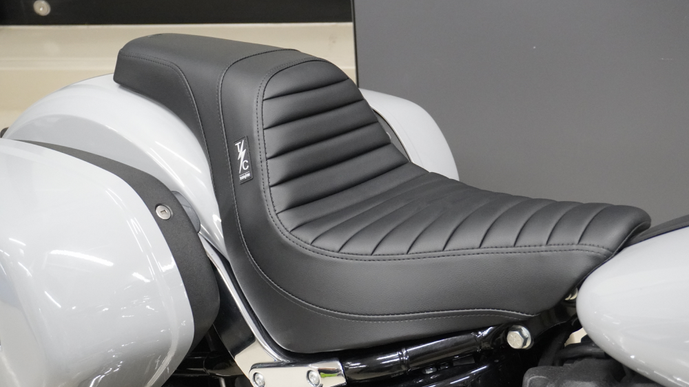 続いて実際に車両に装着します。装着車両は2024年式スポーツグライド。取り付けたのは“Tuck & Roll”仕上がりです。