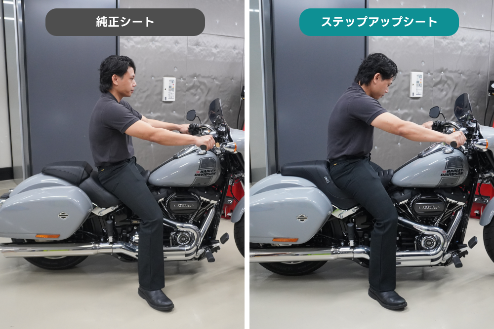 ただし、パッセンジャー部は純正よりも面積が狭く、やや硬めの印象でした。また、純正のライザーやハンドルでは、体格によってはハンドルポジションが遠く感じる場合も。より快適なポジションを実現可能なThrashinのプルバックライザーとの併用がオススメです!
