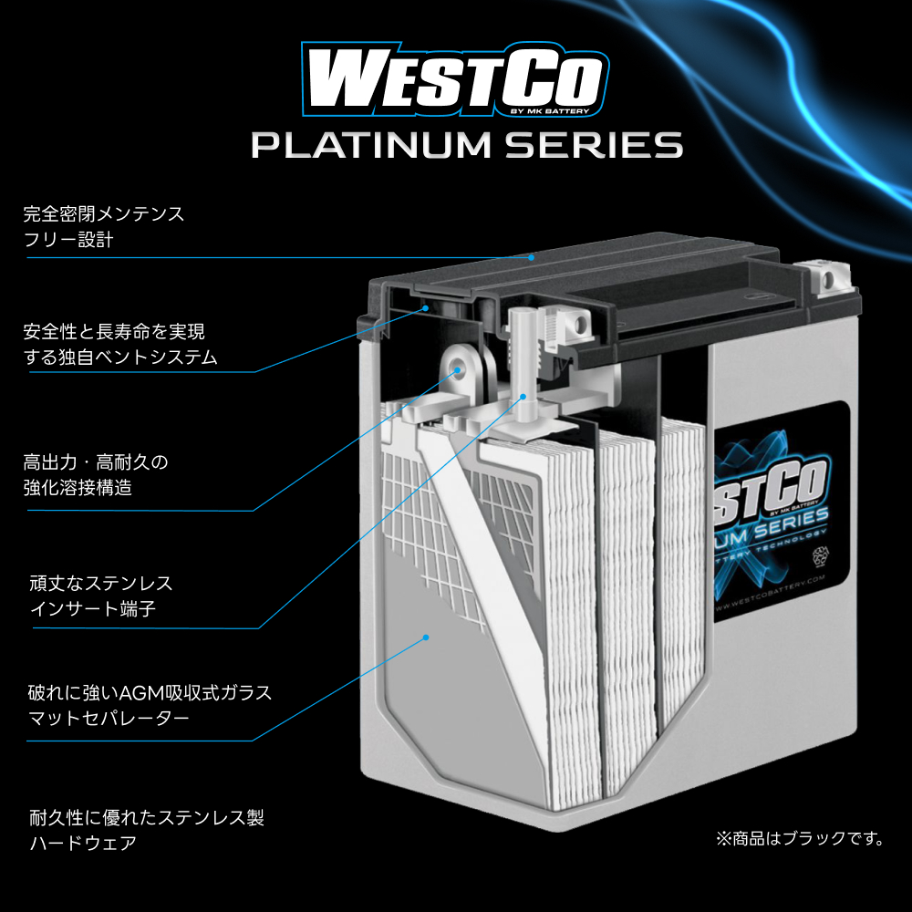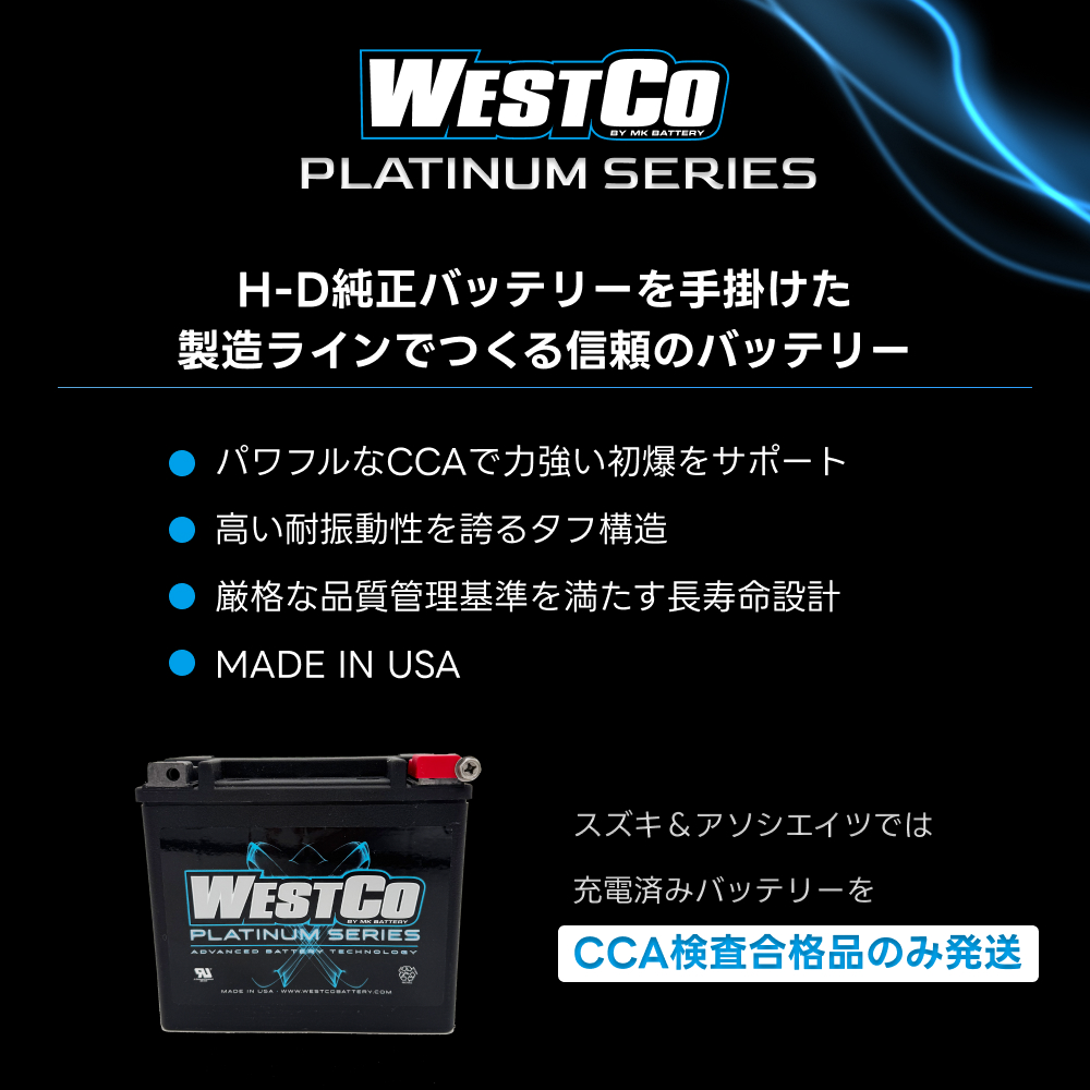 Westco(ウェストコ)バッテリーは、完全密閉型構造によるメンテナンスフリー設計を特徴とし、振動にも強く、液漏れのリスクを排除します。また、Made in USAのWestcoは、CCA(コールド・クランキング・アンペア)性能が高く、初爆時に大きな負荷がかかるハーレーに適した仕様となっています。