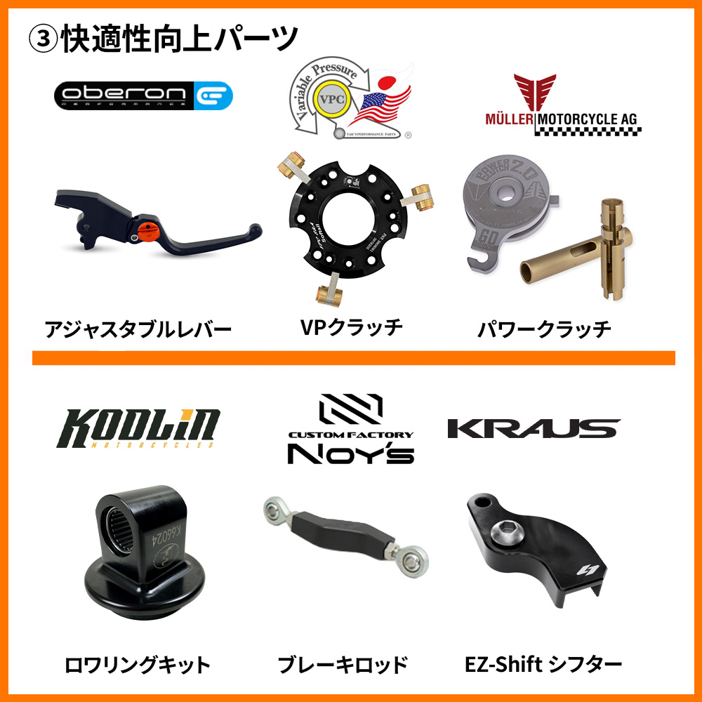 ハンドル周り:ハンドコントロールの変更により対応するハンドルバー、レバー、ケーブル類の使用が必要。