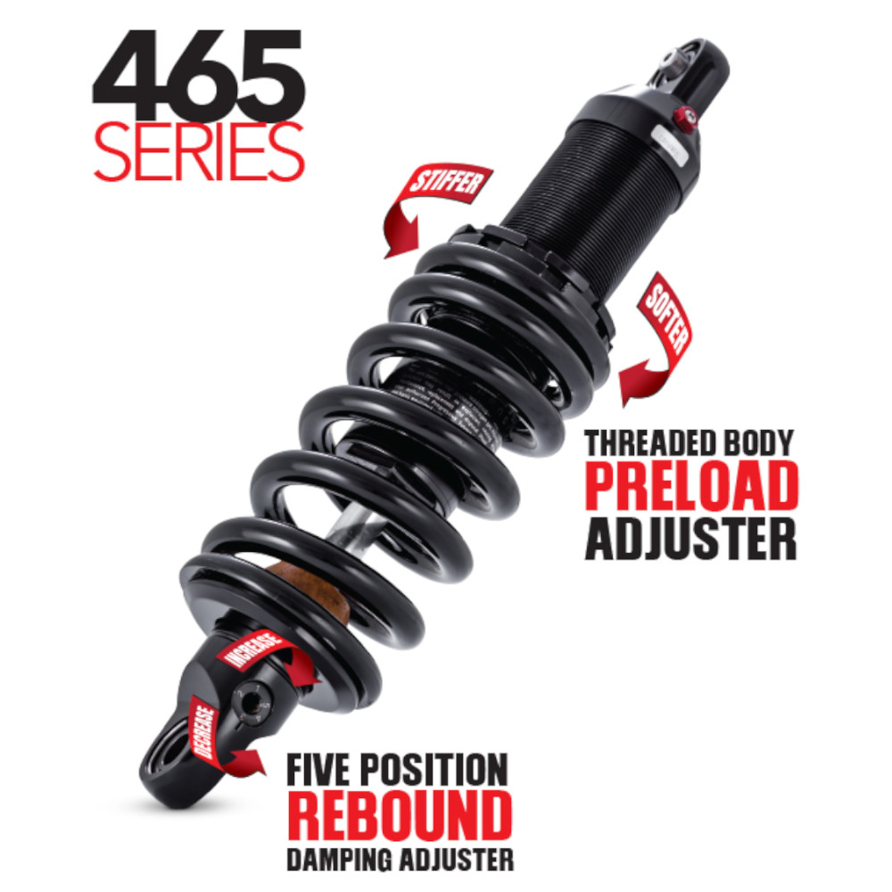 ・465シリーズは、M8ソフテイルモデル用の高圧ガスモノチューブショックのリアサスペンションです。 ・高圧ガスモノチューブを採用しています。 ・リバウンド調整は5段階の調整が可能です。 ・プリロード調整はネジ式です。 ・ブラックアルマイト仕上げです。