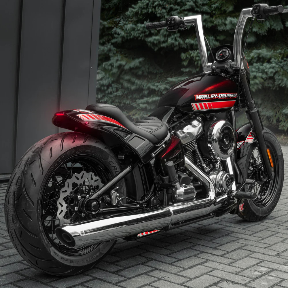 M8ソフテイルモデルに対応する、”BOBBSTR”ショートリアフェンダーキットです。ボバースタイルのデザインと、フェンダーに内蔵されたテールライトにより、リア周りをスタイリッシュに仕上げます。 ・150-200mm幅のリアタイヤに対応 ※①:タンデム乗車を行う場合は、オプションのメタルストラット(タンデム対応補強ストラット)有りをご選択ください。
