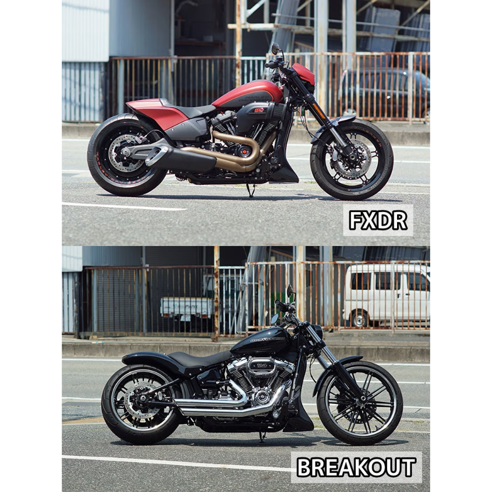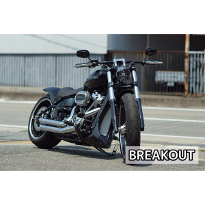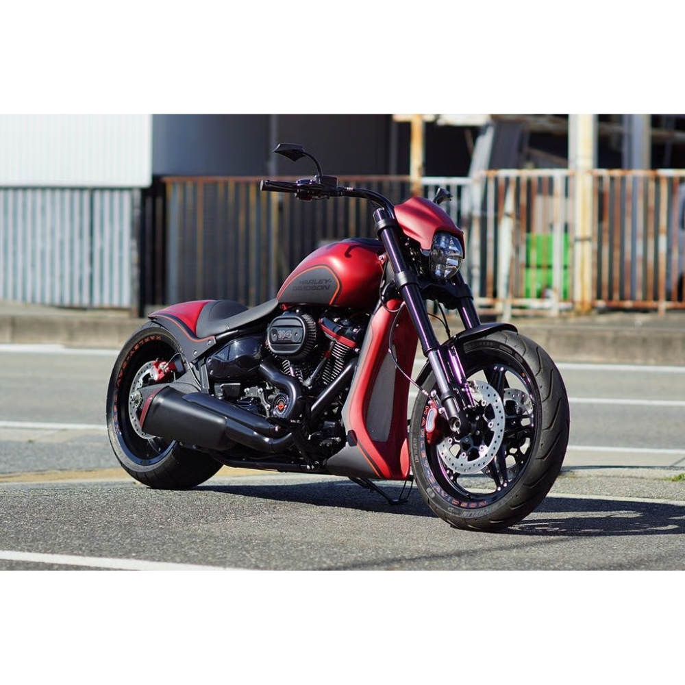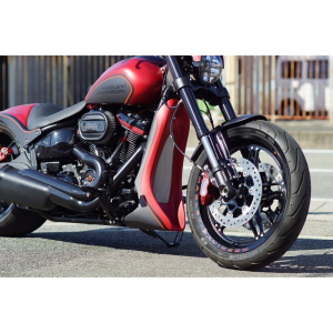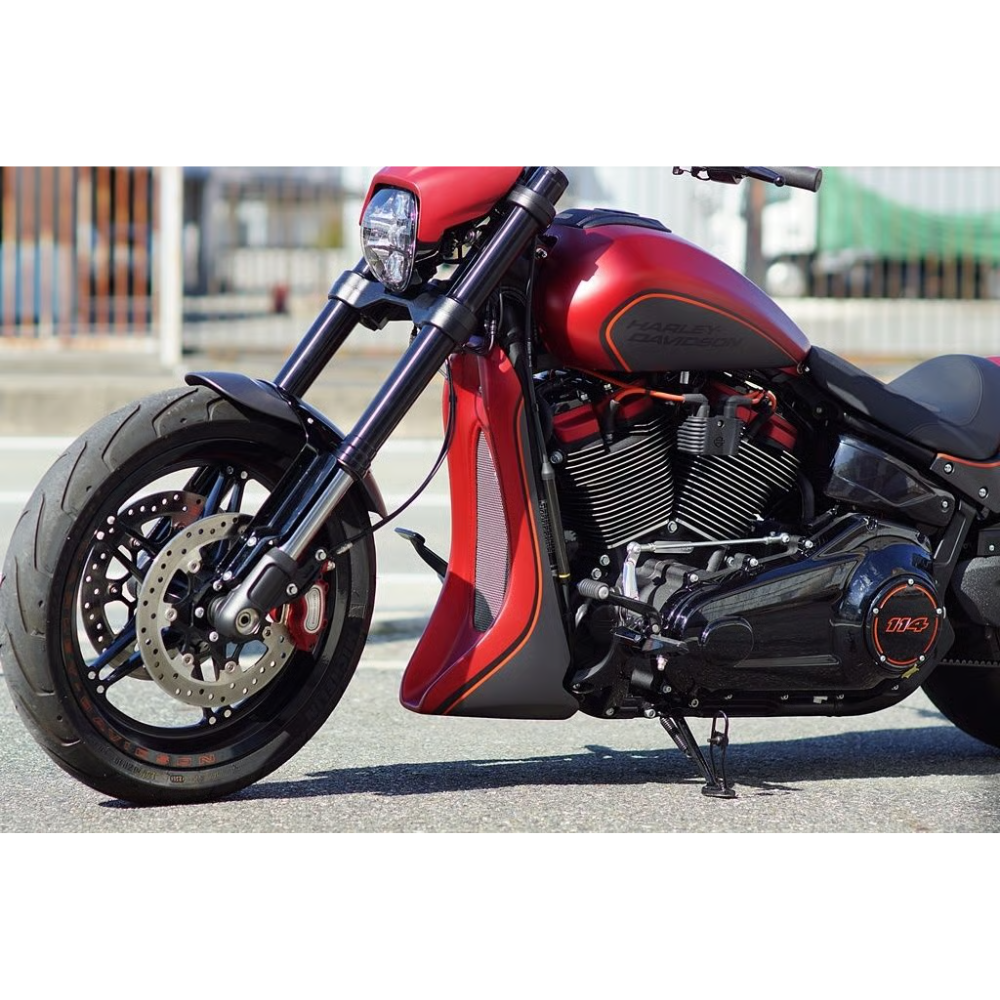 M8 FXDR/ブレイクアウト専用フロントスポイラーです。ダウンチューブをしっかりと覆うデザインで、迫力あるフロントフェイスを演出します。